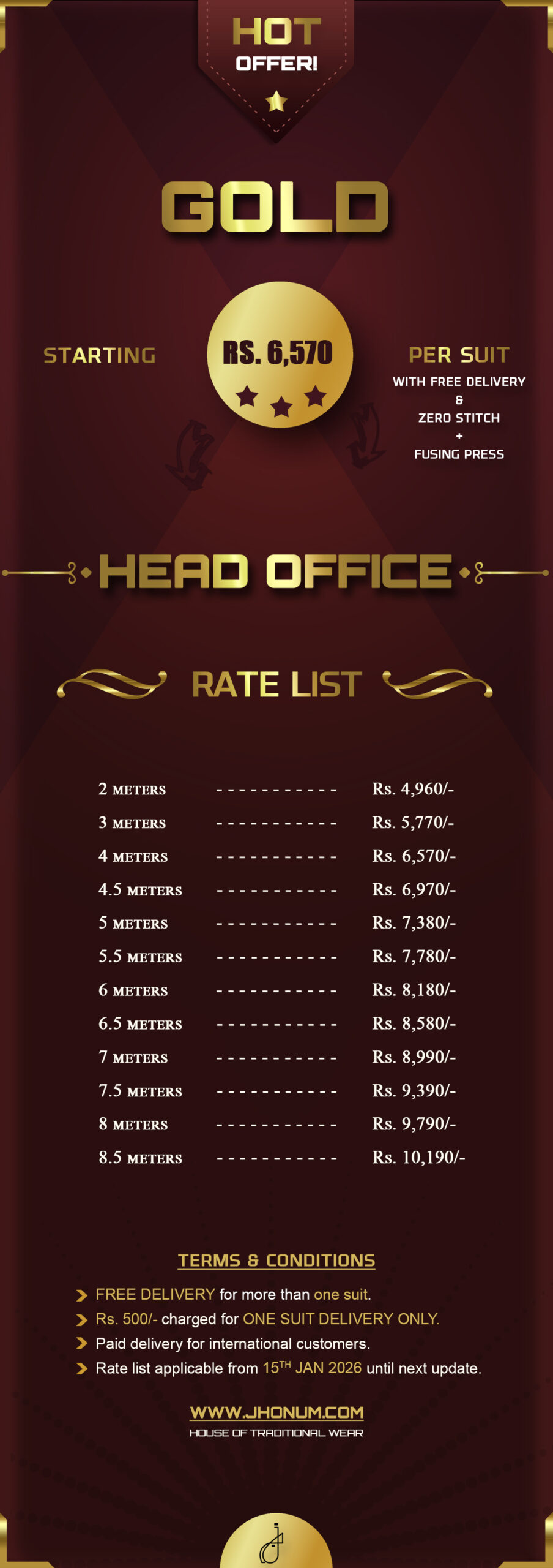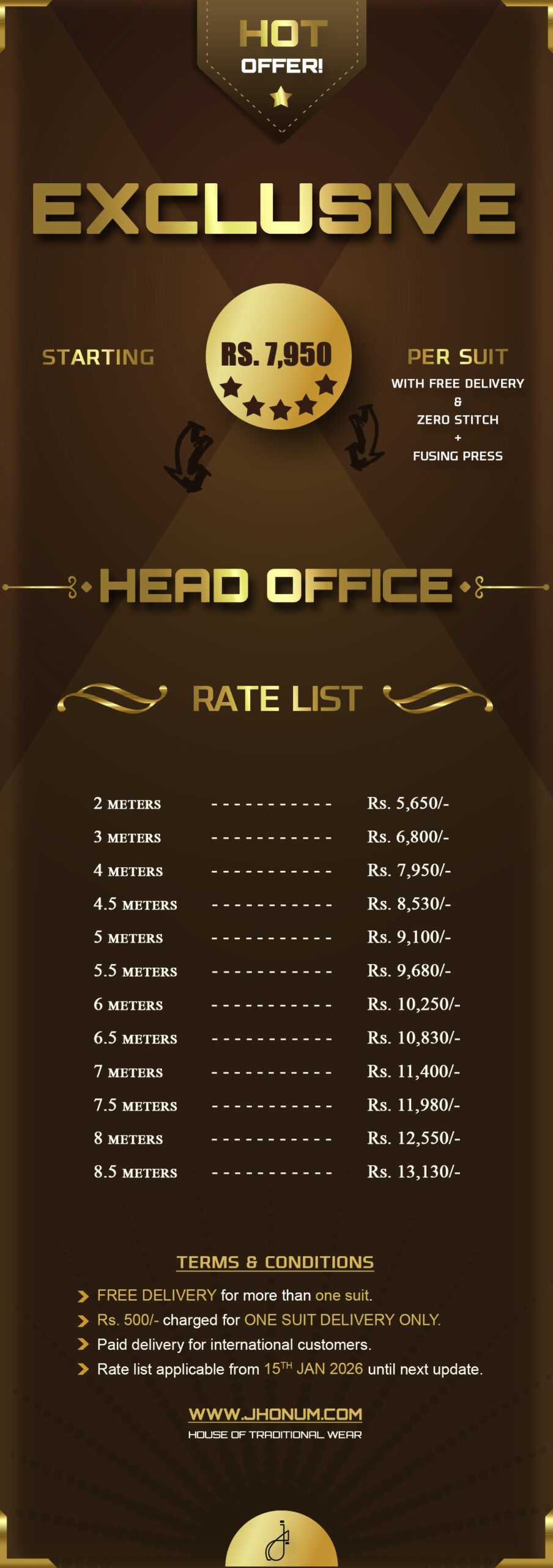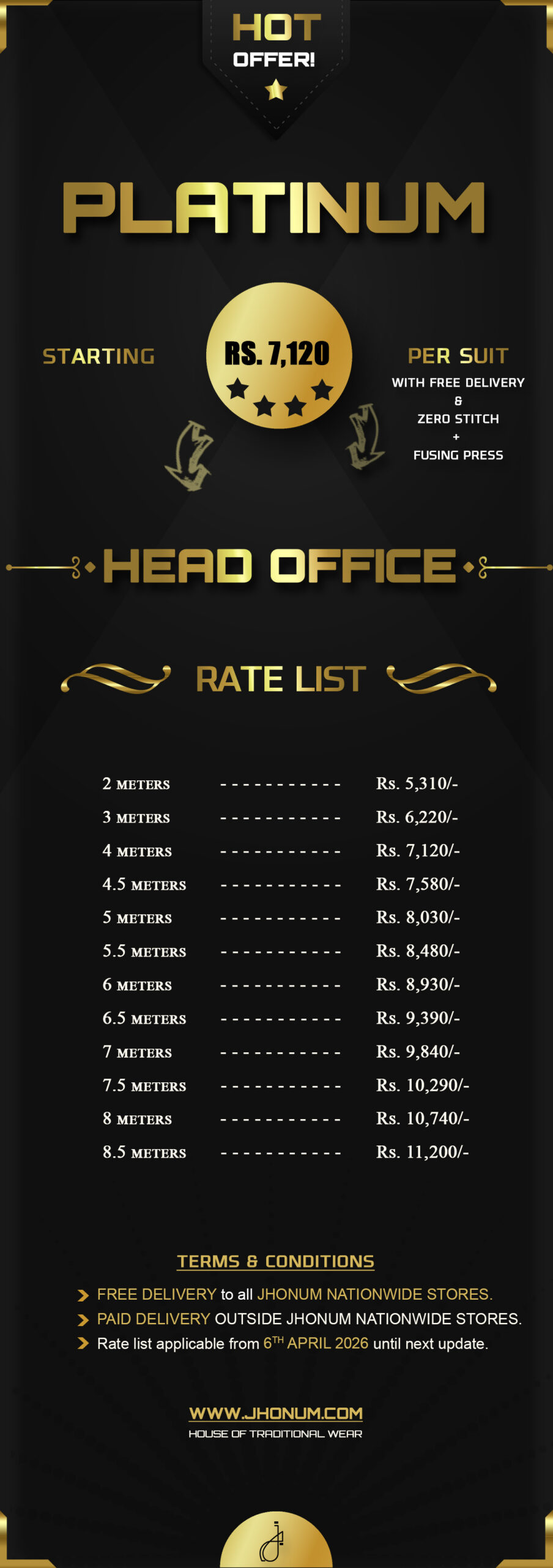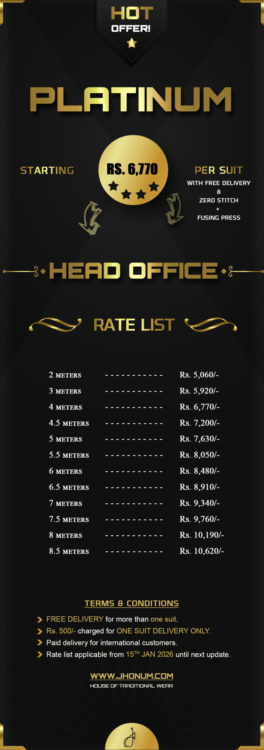 JHONUM pricing sheet displays pricing for all our four featured fabric collections i.e: GOLD, PLATINUM, DIAMOND, EXCLUSIVE, EXCELLENCE, SAPPHIRE & SUITING