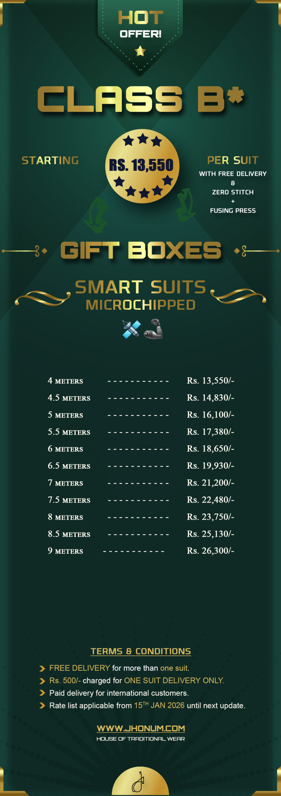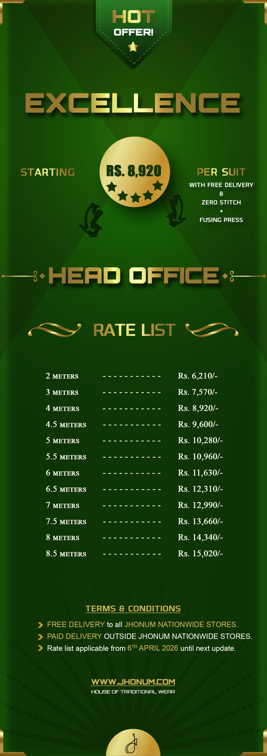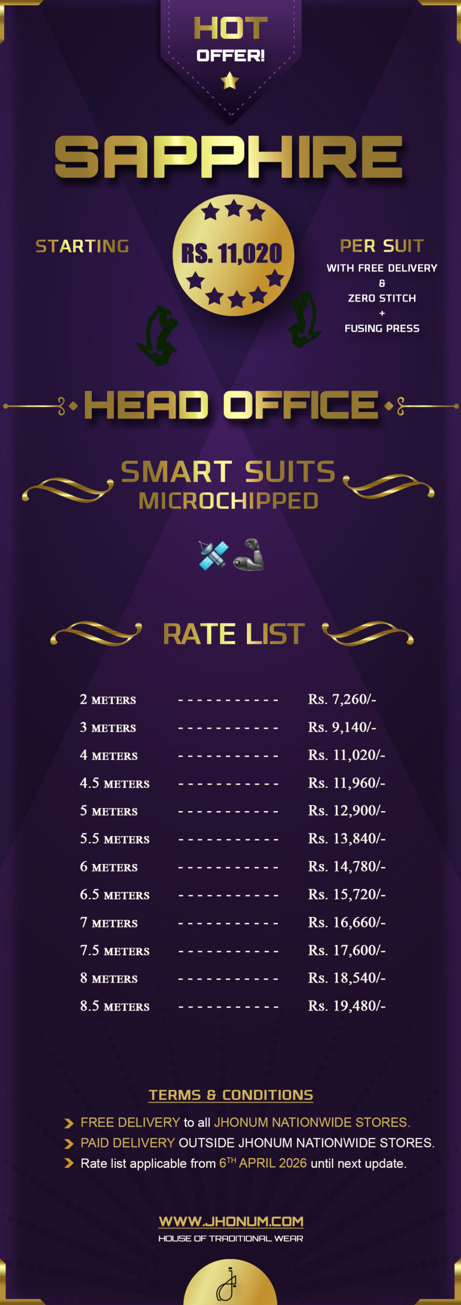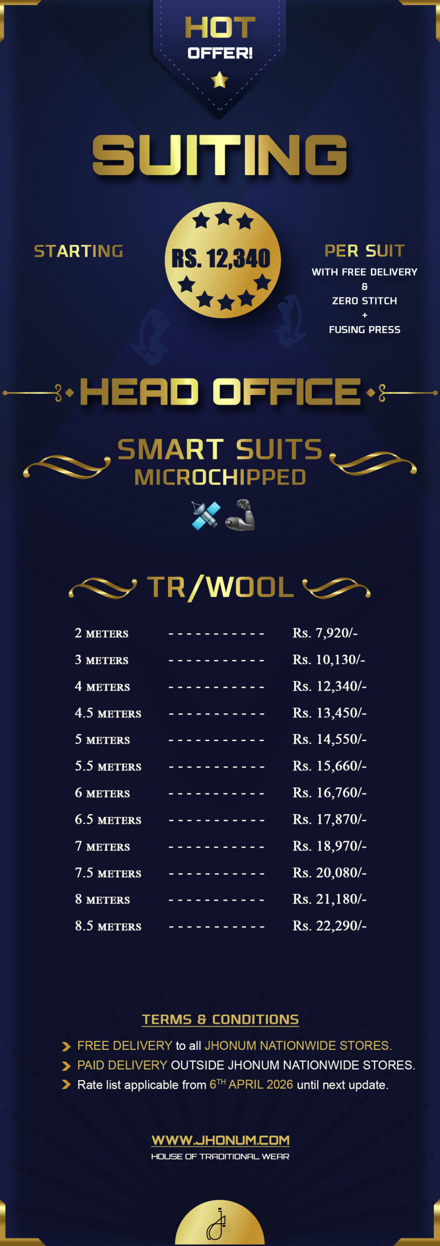 JHONUM pricing sheet displays pricing for all our four featured fabric collections i.e: GOLD, PLATINUM, DIAMOND, EXCLUSIVE, EXCELLENCE, SAPPHIRE & SUITING