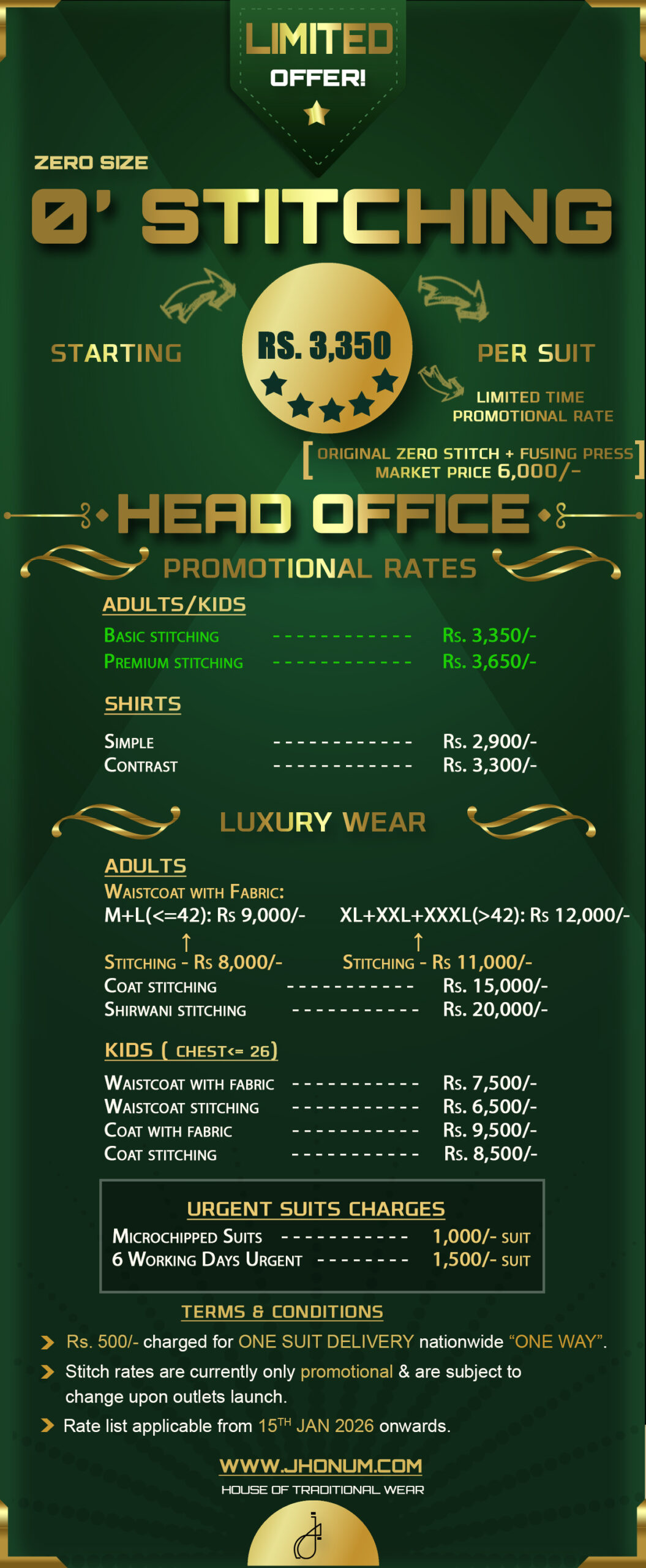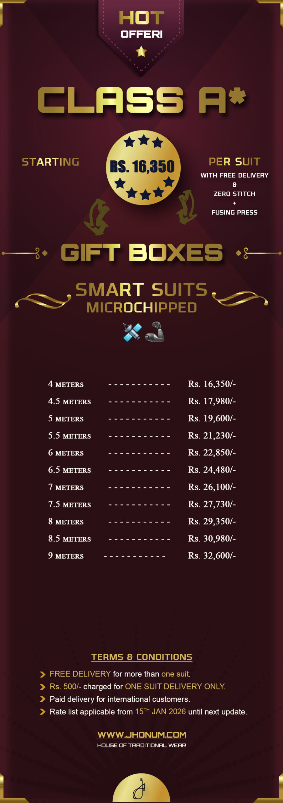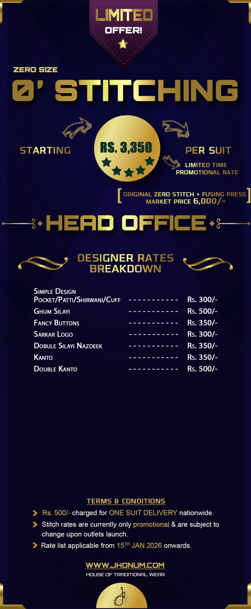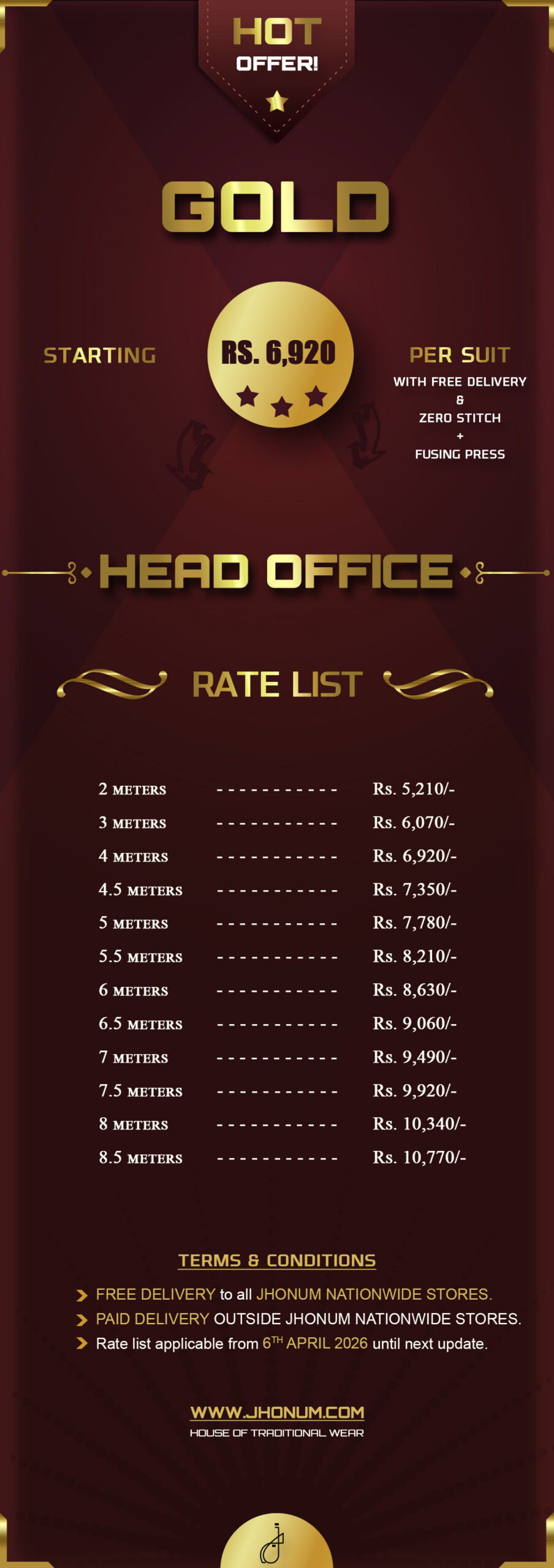 JHONUM pricing sheet displays pricing for all our four featured fabric collections i.e: GOLD, PLATINUM, DIAMOND, EXCLUSIVE, EXCELLENCE, SAPPHIRE & SUITING